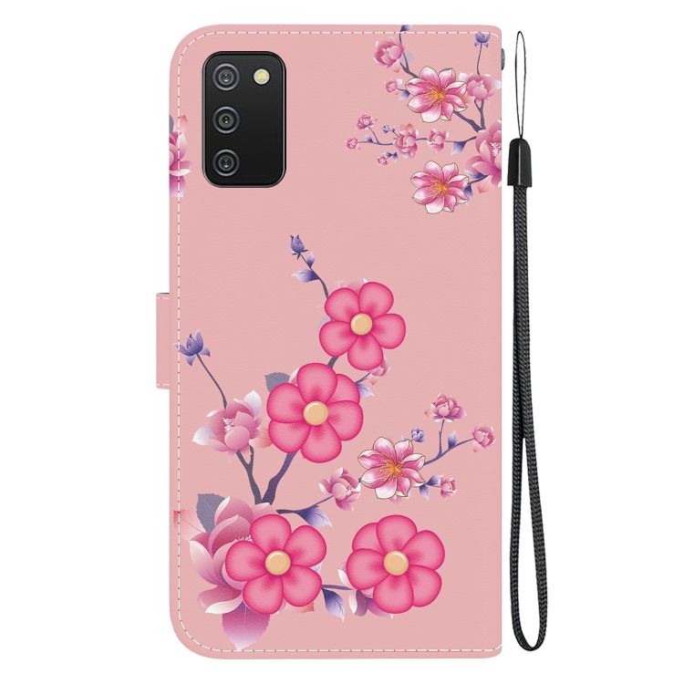Funda para Samsung Galaxy A02S Versión UE Cuero con Dibujo y Textura de Cristal (Flores de Cerezo)