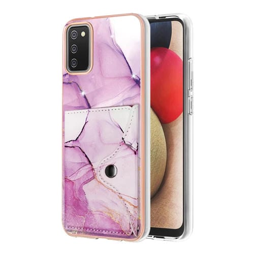 Estuche para Teléfono Samsung Galaxy A02S Versión UE con Ranura para Tarjeta Imd Patrón Mármol (Oro Rosa Púrpura)