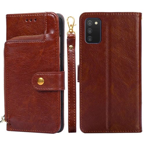 Bolsa de Cremallera para Samsung Galaxy A03S (164.2mm) Caja de Cuero con Soporte Ranuras para Tarjetas y Cordón (Marrón)