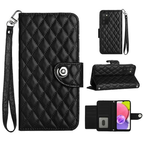 Funda para teléfono Samsung Galaxy A03S con tapa de cuero textura rómbica y cordón (Negro)