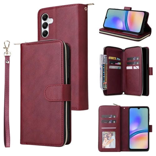 Funda para Samsung Galaxy A05S Cartera con Cremallera 9 Ranuras para Tarjetas (Rojo Vino)