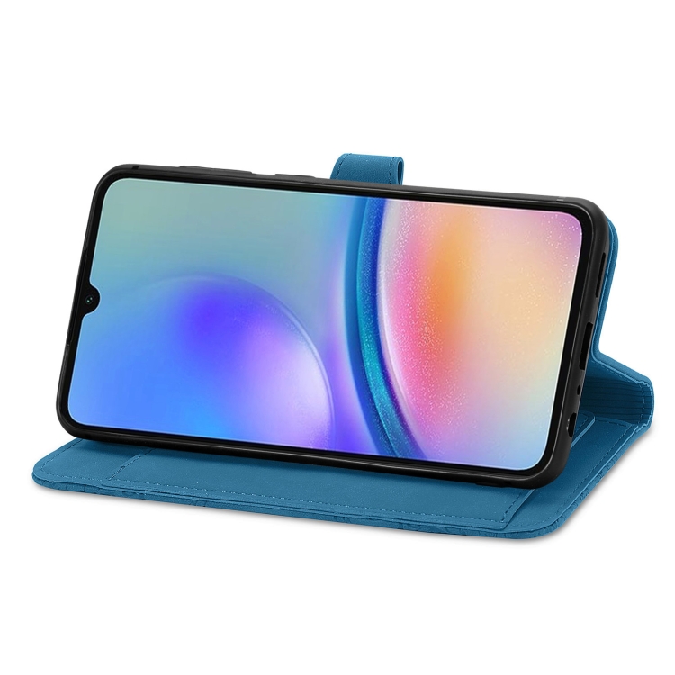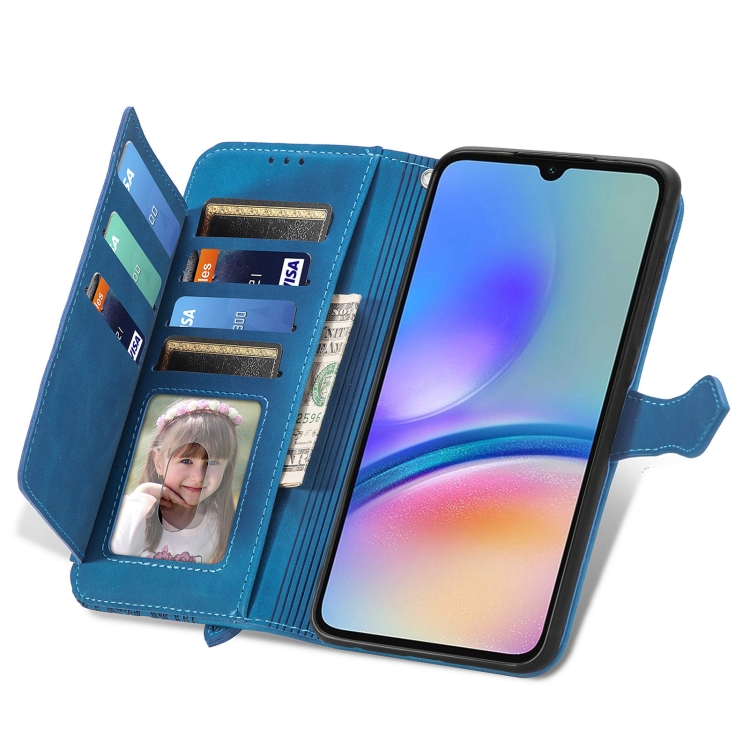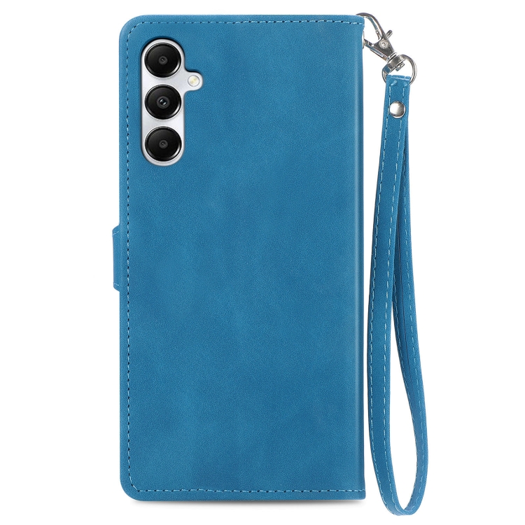 Funda de Cuero Samsung Galaxy A05S con Cremallera y Flores en Relieve (Azul)