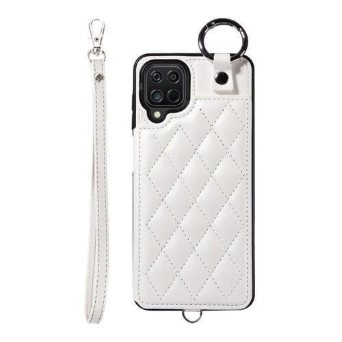 Estuche para Teléfono Samsung Galaxy A12 4G con Bolsa para Tarjetas Textura Rómbica y Cordón Corto (Blanco)