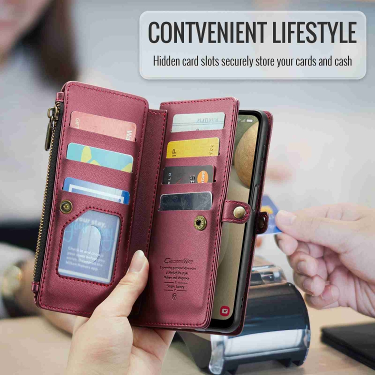 Estuche para teléfono Caseme C36 para Samsung Galaxy A12 5G con ranuras para tarjetas cartera con cremallera antirrobo Rfid (Rojo Vino)