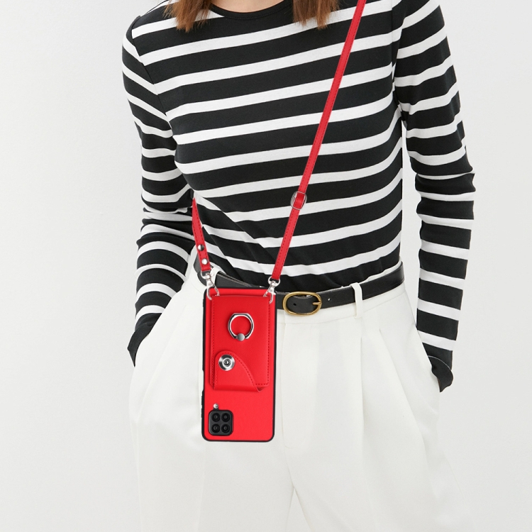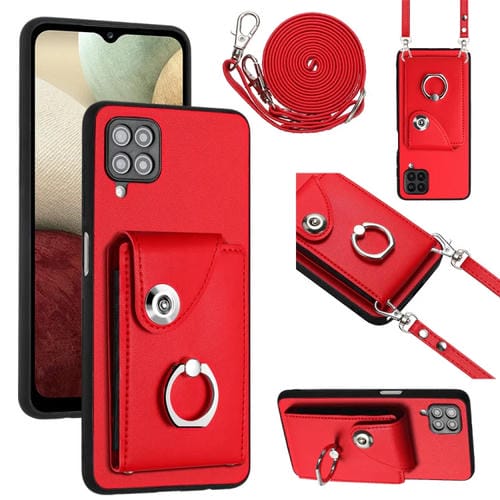 Funda para Teléfono Samsung Galaxy A12 con Soporte para Anillo y Bolsa para Tarjeta con Cordón Largo (Rojo)