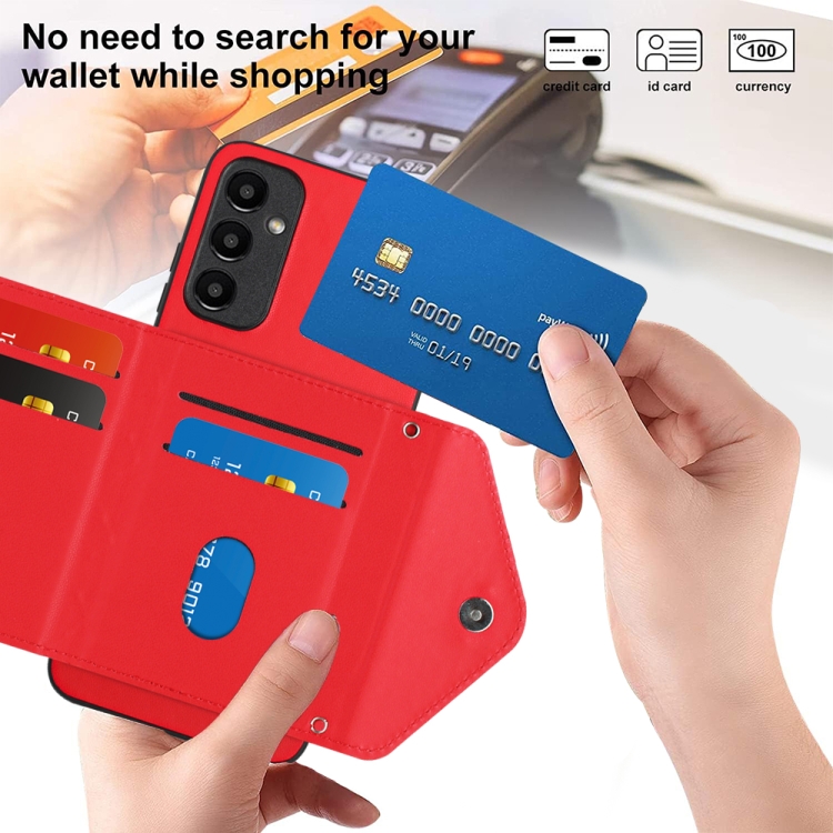 Funda para Teléfono Samsung Galaxy A14 5G Rfid con Bolsa para Tarjetas Textura Rómbica y Cordón Largo (Rojo)