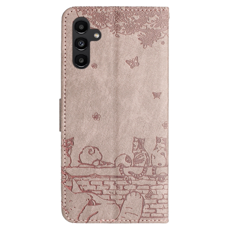 Funda de Cuero Samsung Galaxy A15 5G Estampado de Gato con Cordón (Gris)