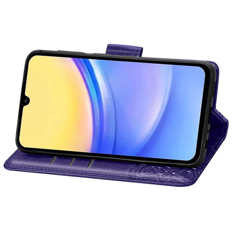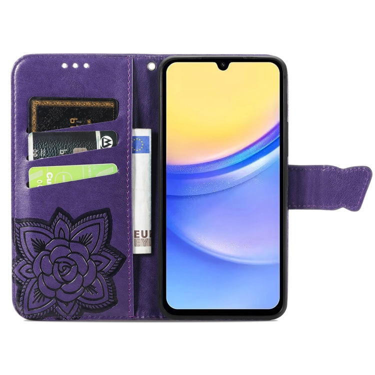 Funda para Teléfono Samsung Galaxy A15 Cuero Relieve Flor de Amor y Mariposa (Púrpura)