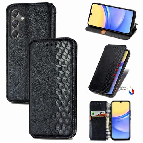 Funda para Teléfono Samsung Galaxy A15 Cuero Magnético Prensado Rejilla Cúbica (Negro)