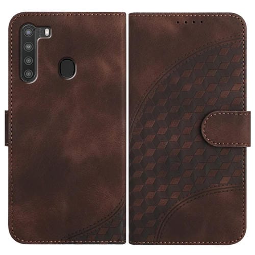 Funda de Cuero Samsung Galaxy A21 Versión UE Yx0060 con Relieve de Cabeza de Elefante y Cordón (Café)