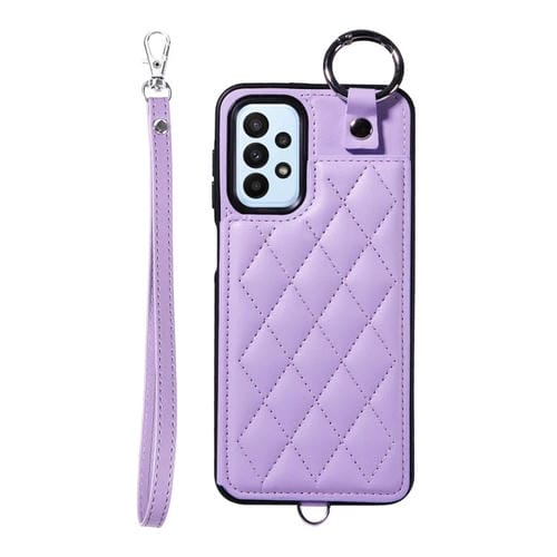 Estuche para Teléfono Samsung Galaxy A23 con Bolsa para Tarjetas Textura Rómbica y Cordón Corto (Púrpura)
