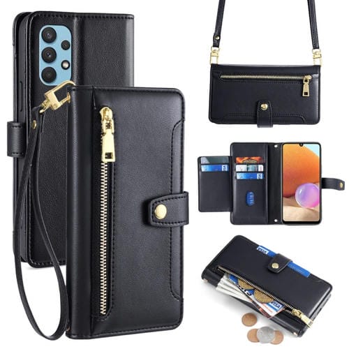Funda de Cuero Samsung Galaxy A32 4G con Billetera, Cremallera y Textura de Oveja (Negro)