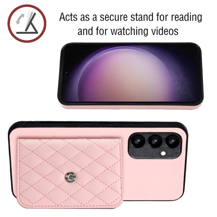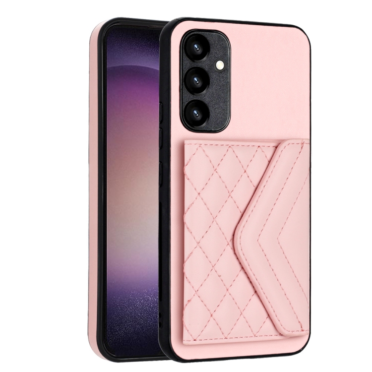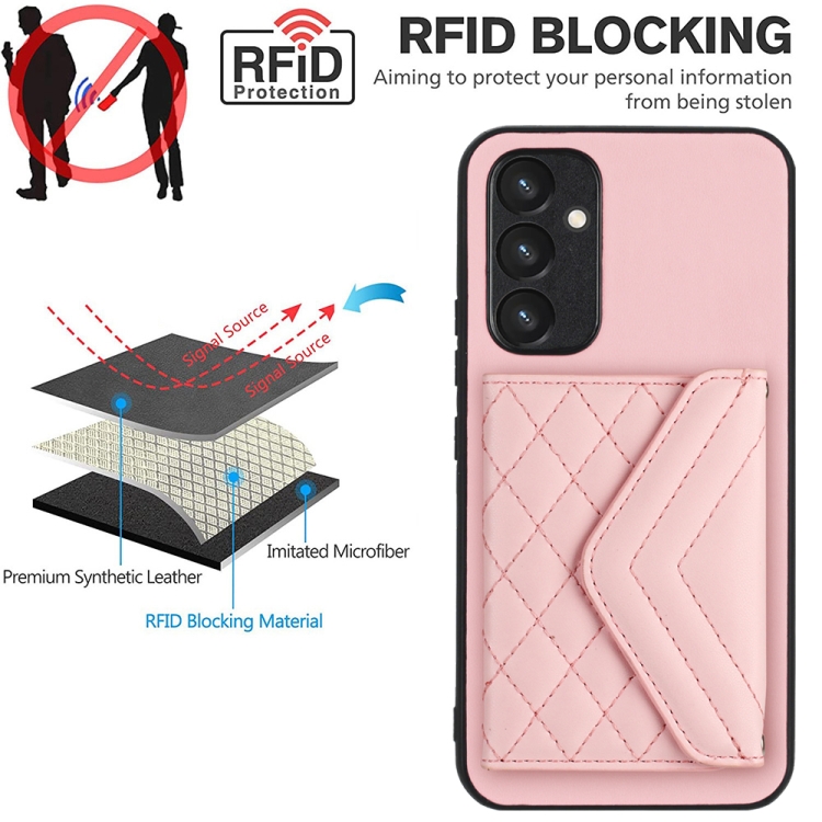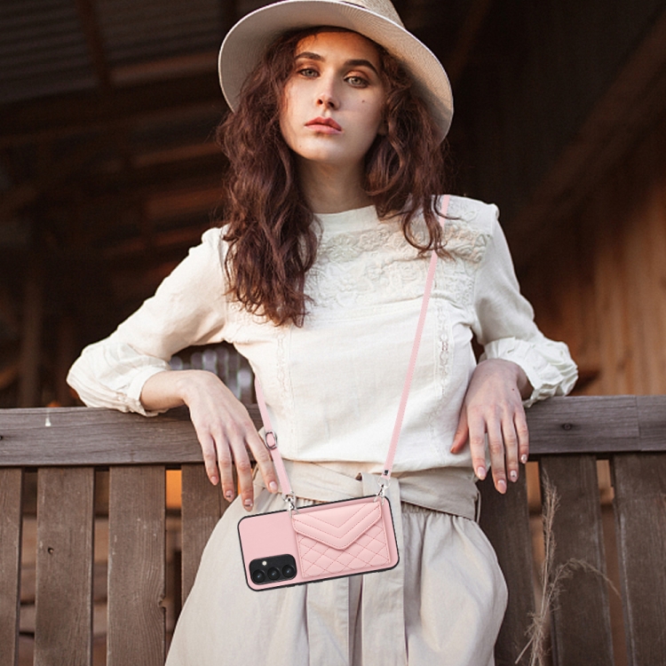 Funda para Teléfono Samsung Galaxy A34 5G Rfid con Bolsa para Tarjetas Textura Rómbica y Cordón Largo (Oro Rosa)