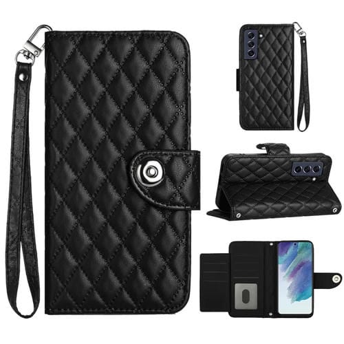 Funda para Teléfono Samsung Galaxy S21 FE 5G con Tapa de Cuero Textura Romboidal y Cordón (Negro)
