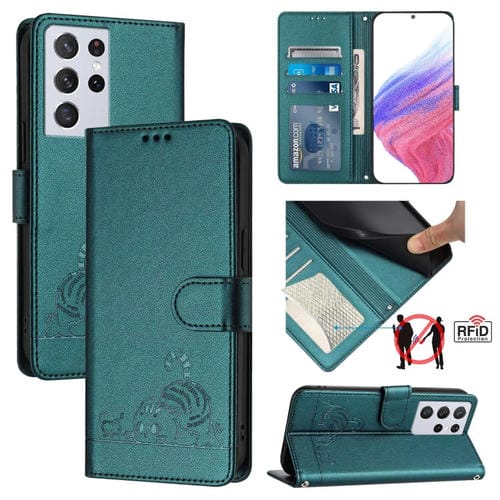 Estuche para teléfono Samsung Galaxy S21 Ultra 5G Cat Rat Cuero Rfid patrón en relieve y cordón (Verde Pavo Real)