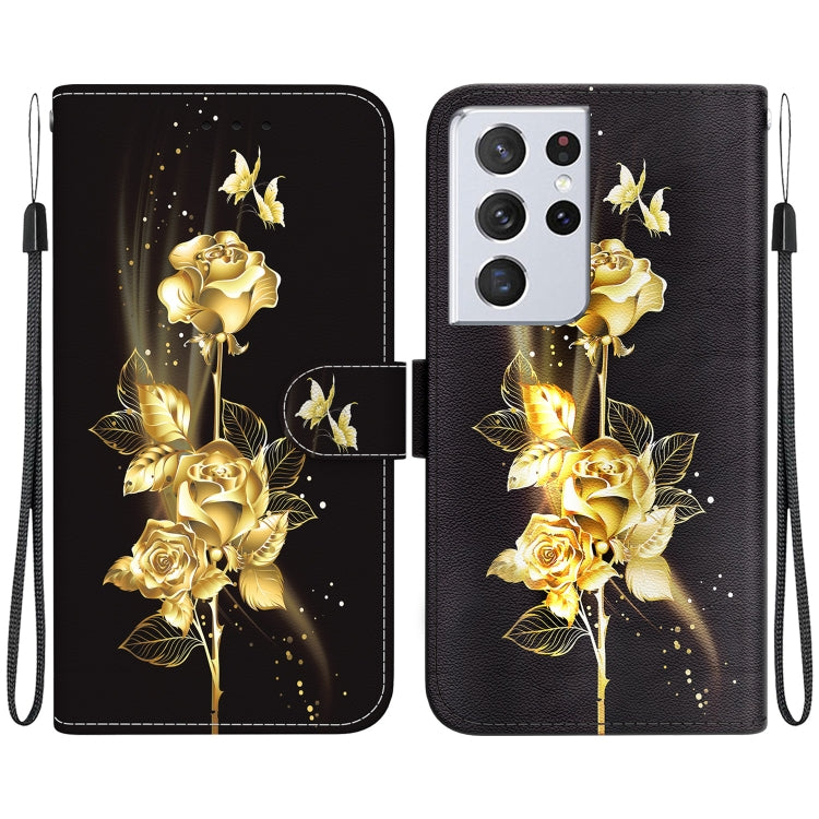 Estuche de Cuero Samsung Galaxy S21 Ultra 5G con Dibujo Coloreado y Textura de Cristal (Mariposa Dorada Rosa)