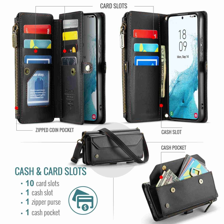 Funda cartera para Samsung Galaxy S22+ 5G Caseme C36 con ranuras para tarjetas y cremallera (Negro)