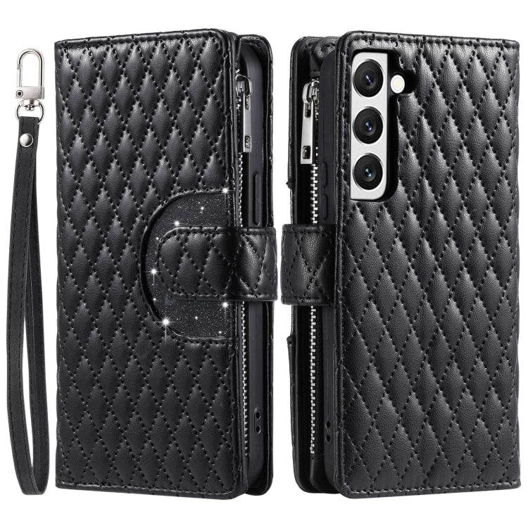 Estuche de Cuero Samsung Galaxy S22 + 5G con Billetera, Cremallera y Celosía con Purpurina (Negro)