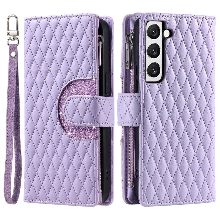 Estuche de Cuero Samsung Galaxy S22 + 5G con Billetera, Cremallera y Purpurina (Púrpura)