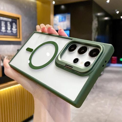 Estuche para teléfono Samsung Galaxy S24 Ultra 5G Magsafe con soporte y marco de lente de metal (Verde)