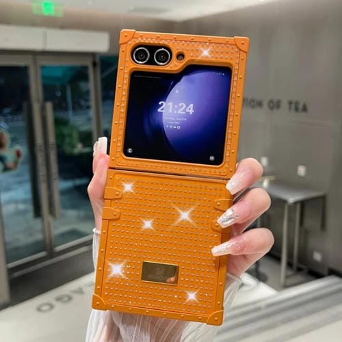 Estuche para teléfono Samsung Galaxy Z Flip3 5G PC a prueba de golpes con diamantes completos y logotipo de cisne (Naranja)