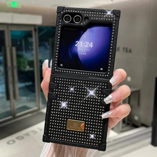 Estuche para Teléfono Samsung Galaxy Z Flip3 5G PC a Prueba de Golpes con Diamantes Completos y Logotipo de Cisne (Negro)