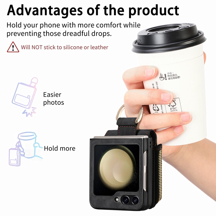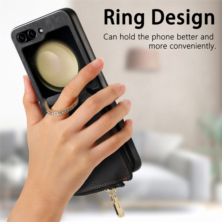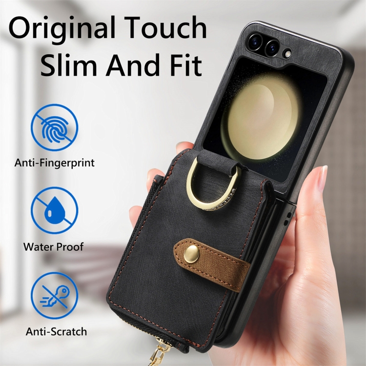 Funda para Teléfono Samsung Galaxy Z Flip5 5G con Billetera, Cremallera y Anillo con Sensación de Piel Retro (Negro)