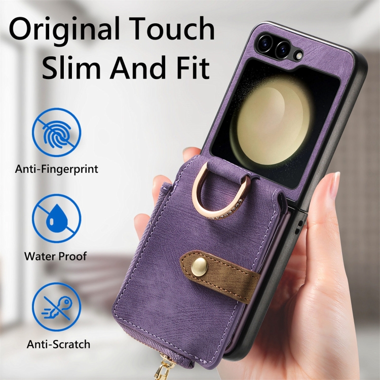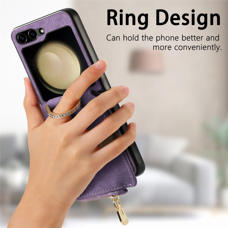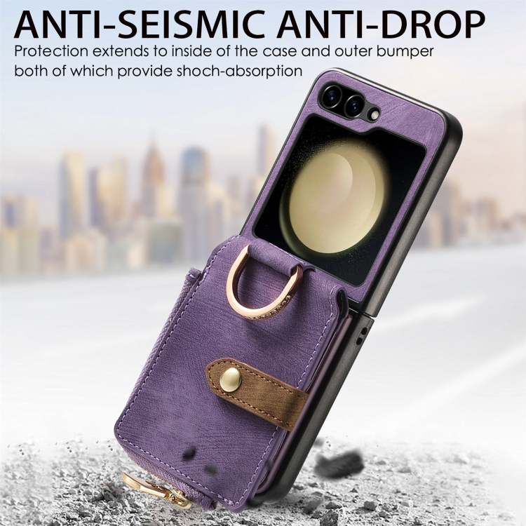 Funda para Teléfono Samsung Galaxy Z Flip5 5G con Billetera, Cremallera y Anillo con Sensación de Piel Retro (Púrpura)