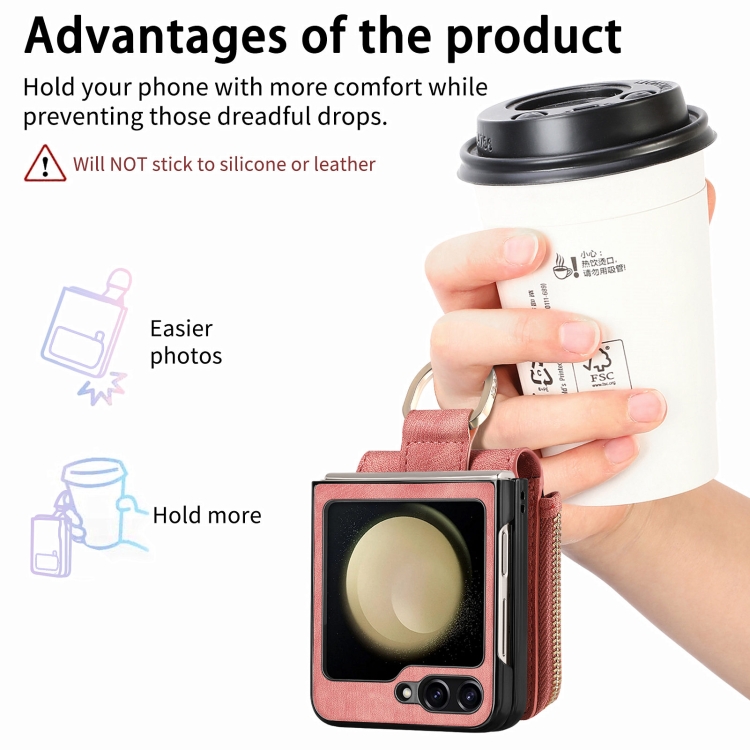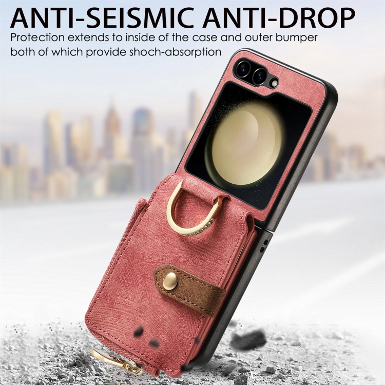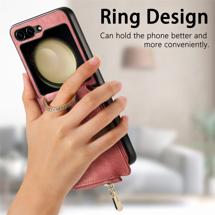 Funda para Teléfono Samsung Galaxy Z Flip5 5G con Billetera, Cremallera y Anillo con Sensación de Piel Retro (Rosa)