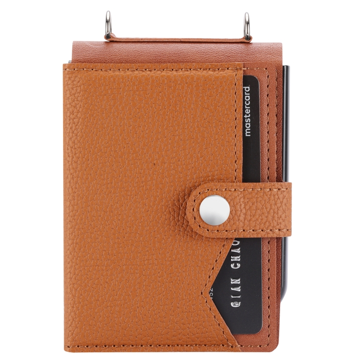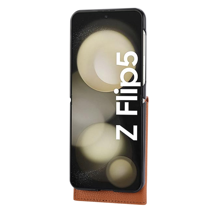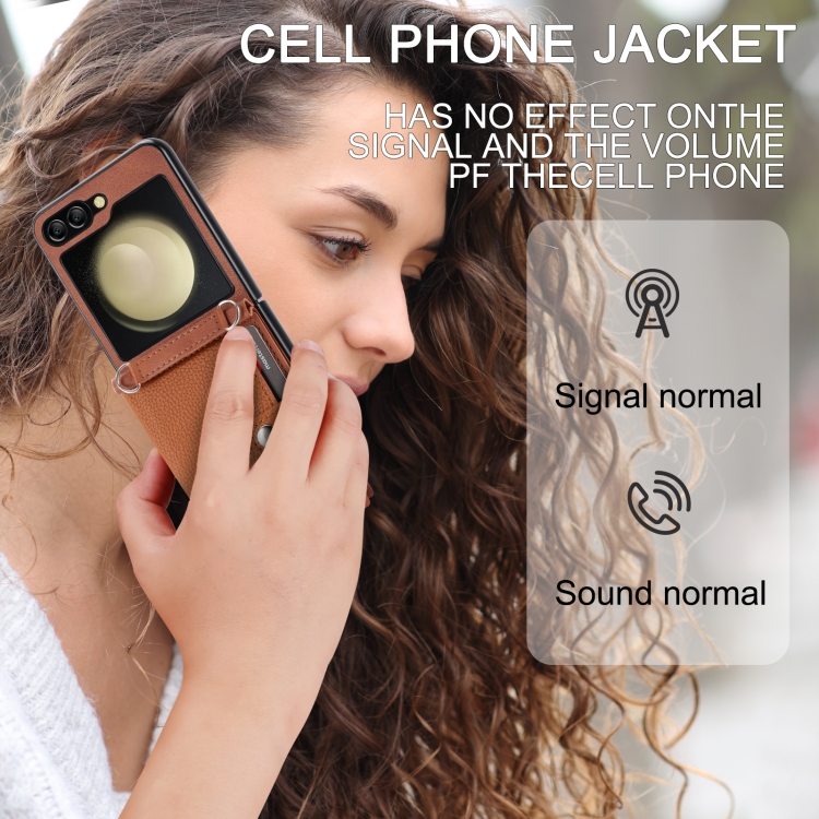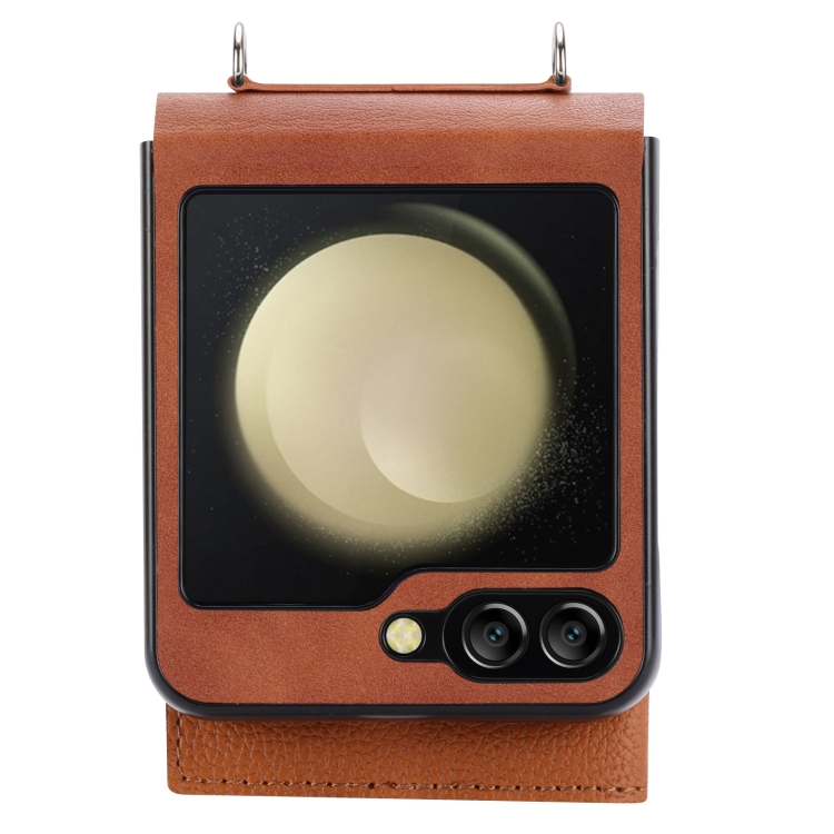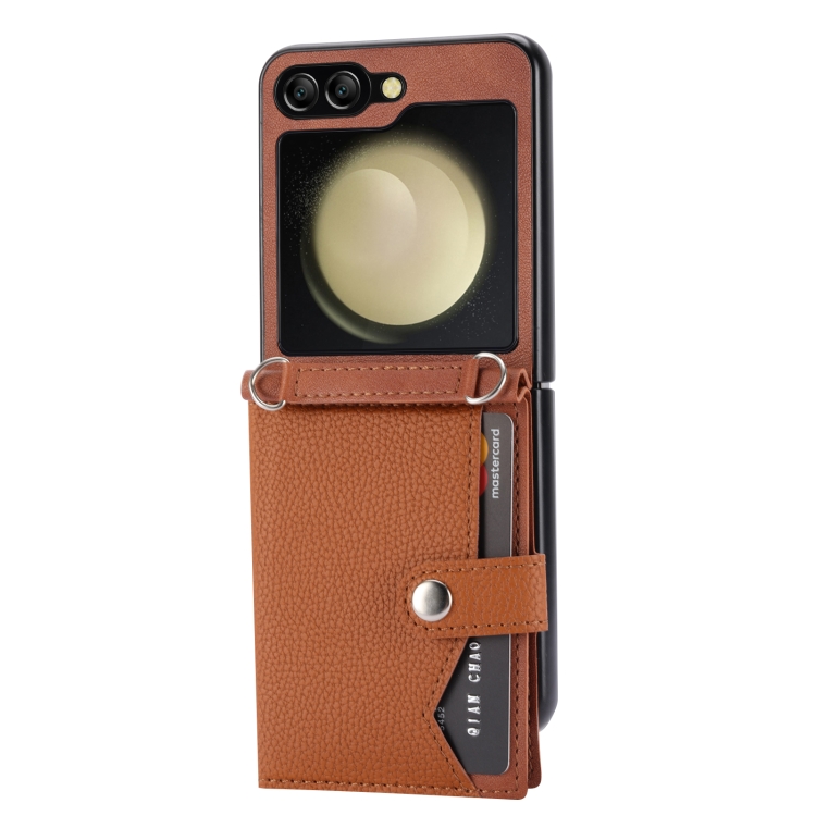 Funda para Samsung Galaxy Z Flip5 Litchi Pattern con Tarjetero y Cordón Largo (Marrón)