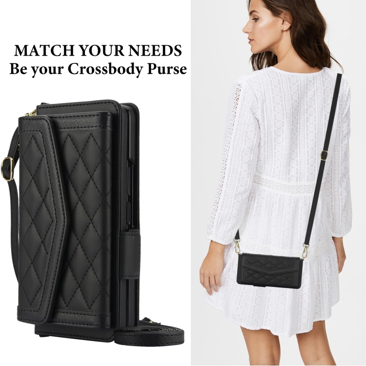 Estuche para teléfono Samsung Galaxy Z Fold5 con tarjetero textura rómbica y empalme con cordón (Negro)
