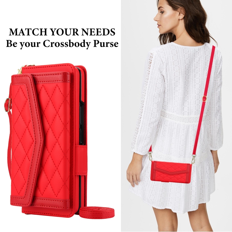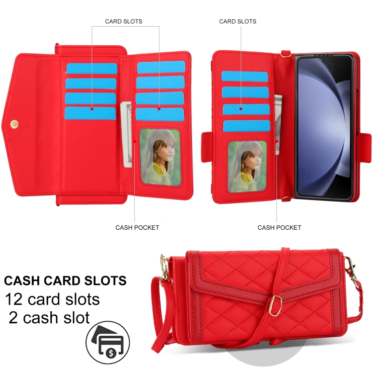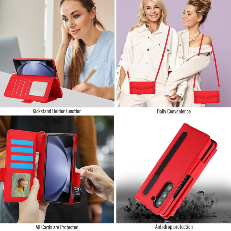 Estuche para Teléfono Samsung Galaxy Z Fold5 con Tarjetero Textura Rómbica y Empalme con Cordón (Rojo)