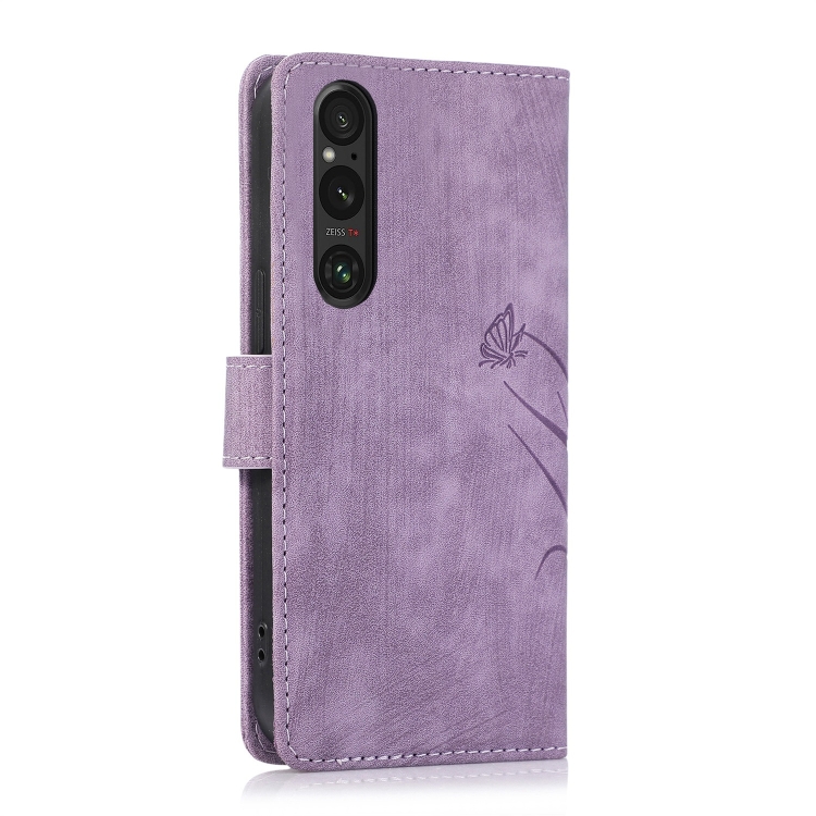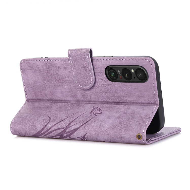 Funda para Sony Xperia 1 V 5G (2023) de Cuero con Relieve Mariposa Orquídea (Púrpura)