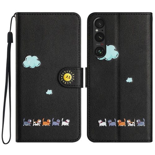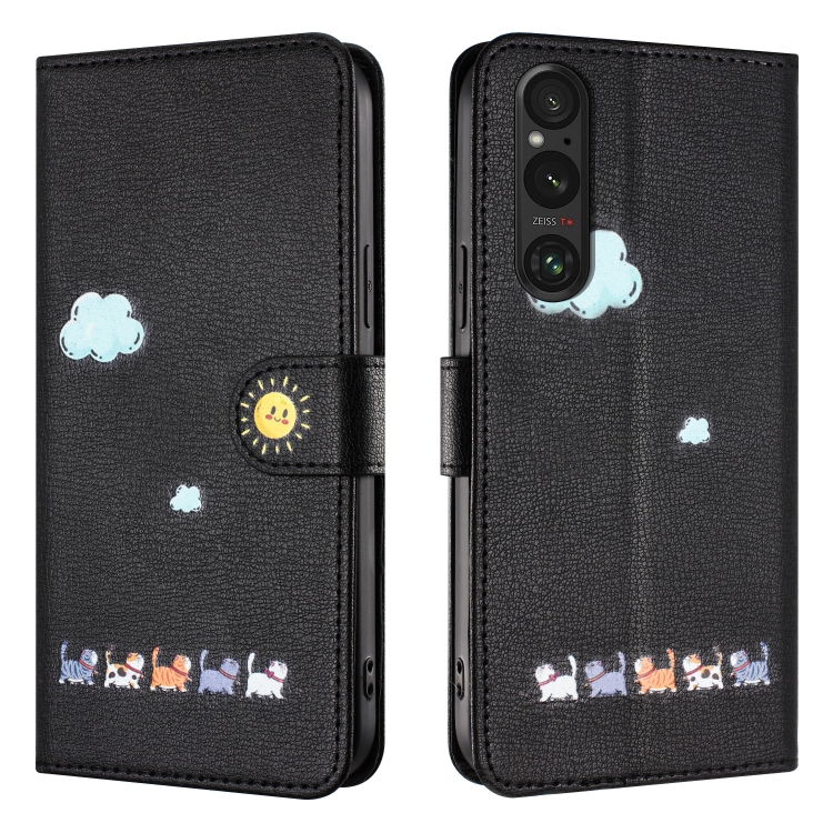 Funda de Cuero para Sony Xperia 1 V con Gatos de Dibujos Animados (Negro)