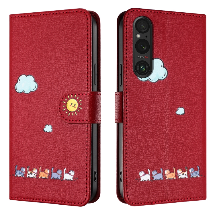 Funda de Cuero Sony Xperia 1 V con Gatos de Dibujos Animados (Rojo)