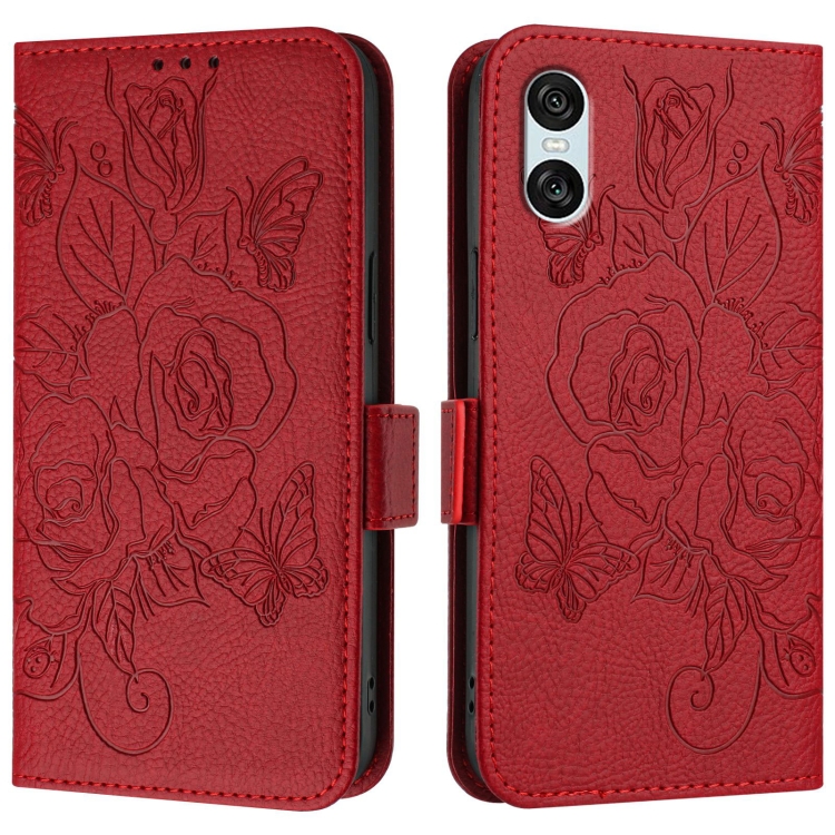Estuche para Sony Xperia 10 Vi de Cuero Antirrobo RFID con Rosa en Relieve (Rojo)