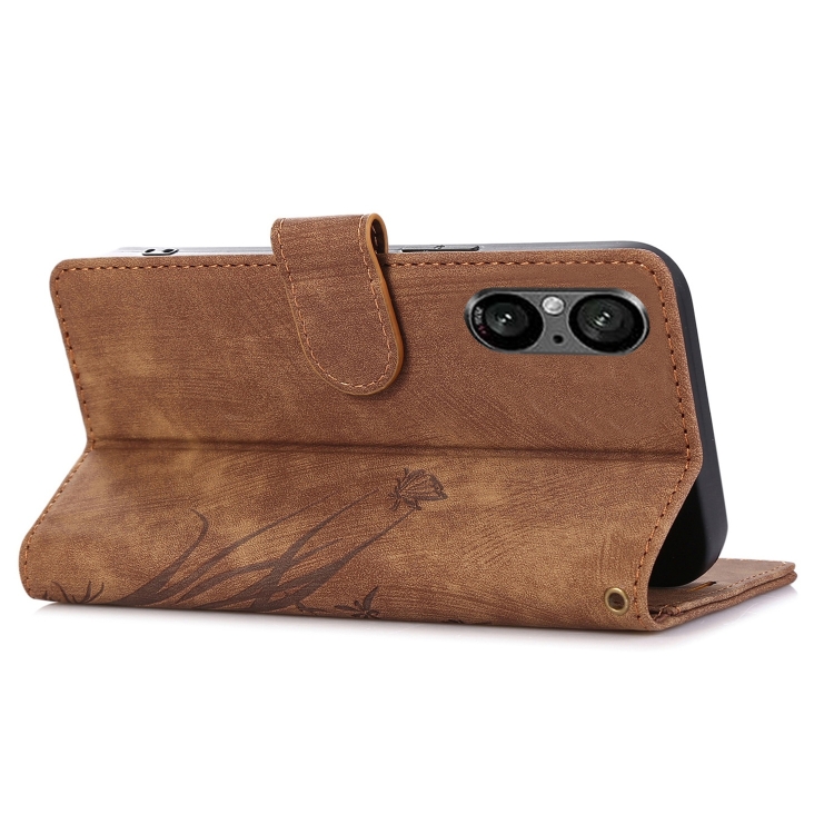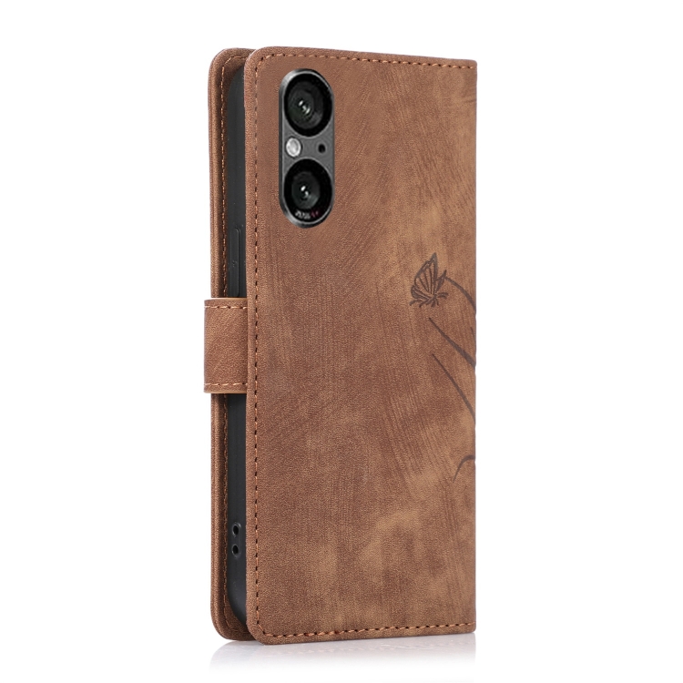 Funda para Sony Xperia 5 V 5G de Cuero con Relieve Mariposa Orquídea (Marrón)