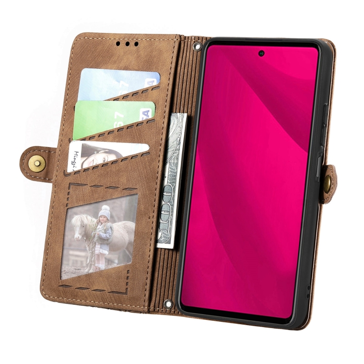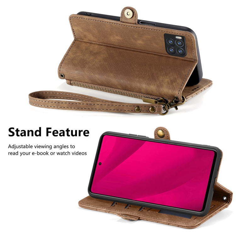 Funda de Cuero para T-Mobile Revvl 7 Pro 5G con Hebilla y Billetera con Cremallera (Marrón)