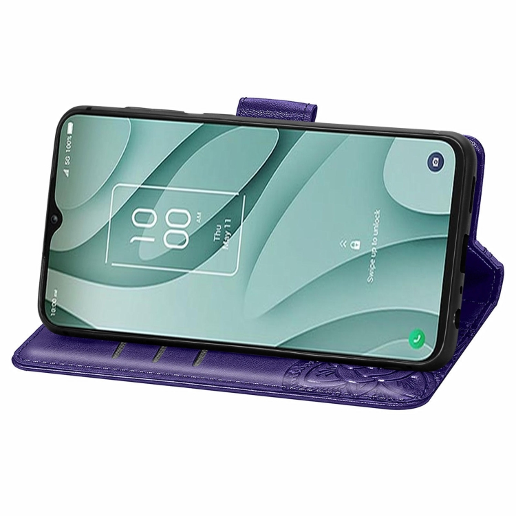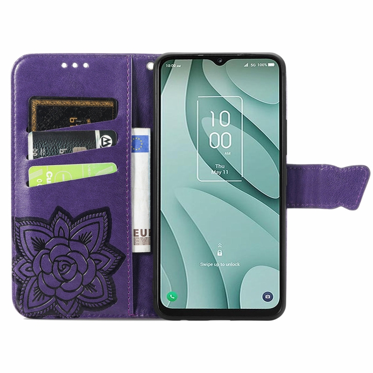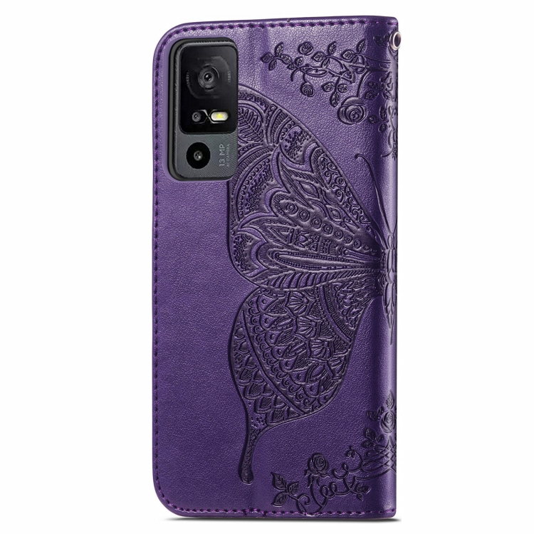 Funda de Cuero para TCL 40 Xe Butterfly Love Flower en Relieve (Púrpura Oscuro)