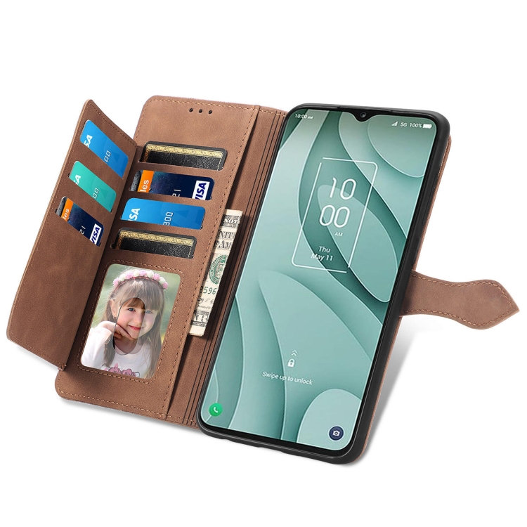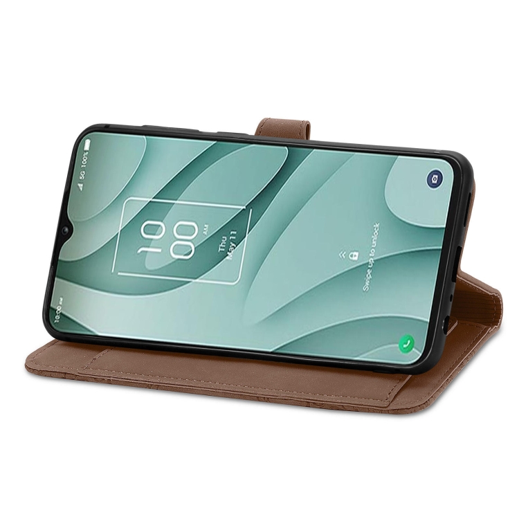 Funda de Cuero para TCL 40 Xe con Cremallera y Flor en Relieve (Marrón)