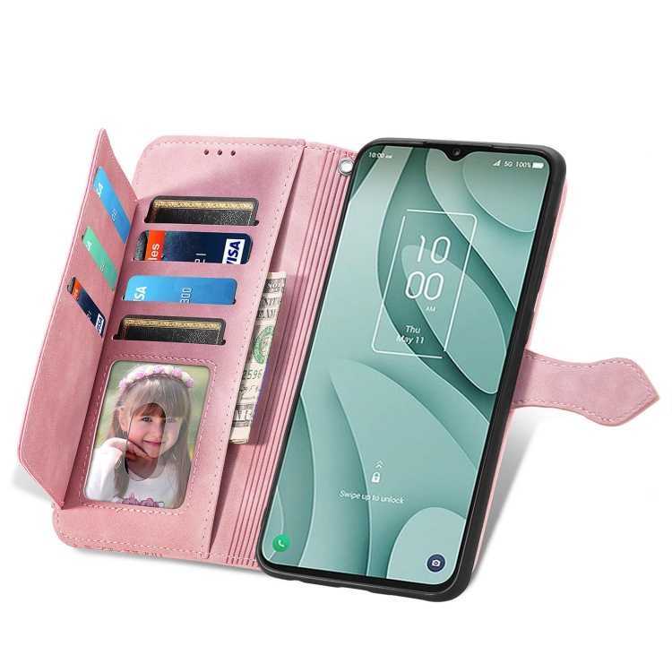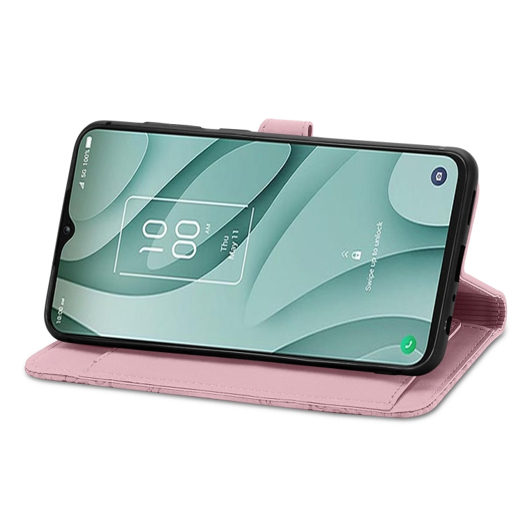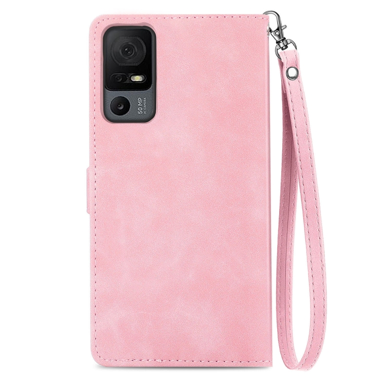 Funda de Cuero para TCL 40 Xl con Cremallera y Flores en Relieve (Rosa)