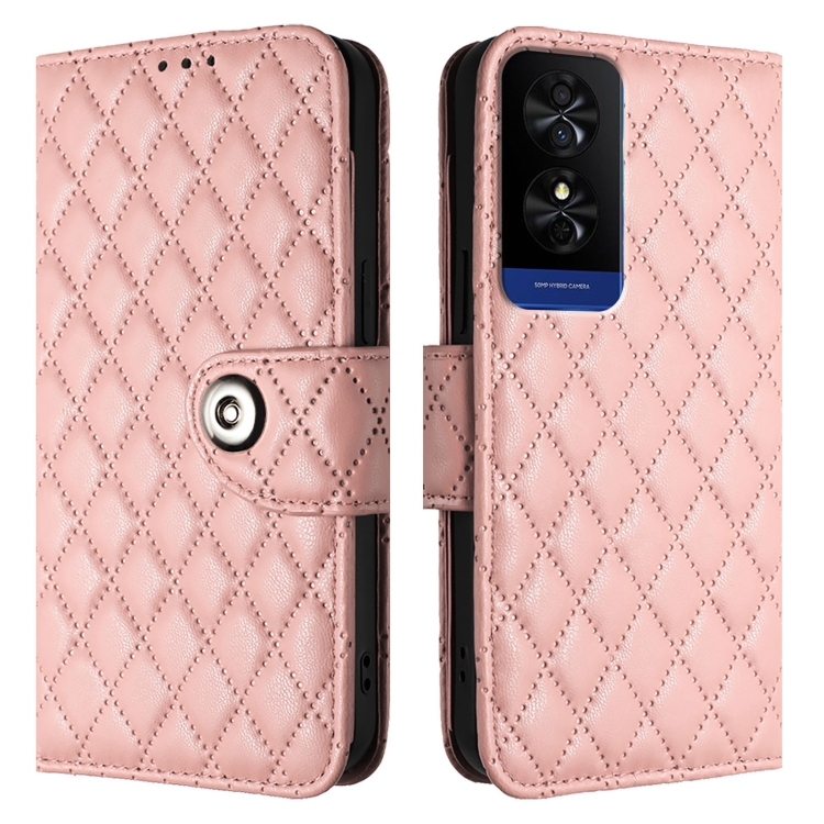 Funda para TCL 50 5G de Cuero con Tapa, Textura Romboidal y Cordón (Rosa Coral)