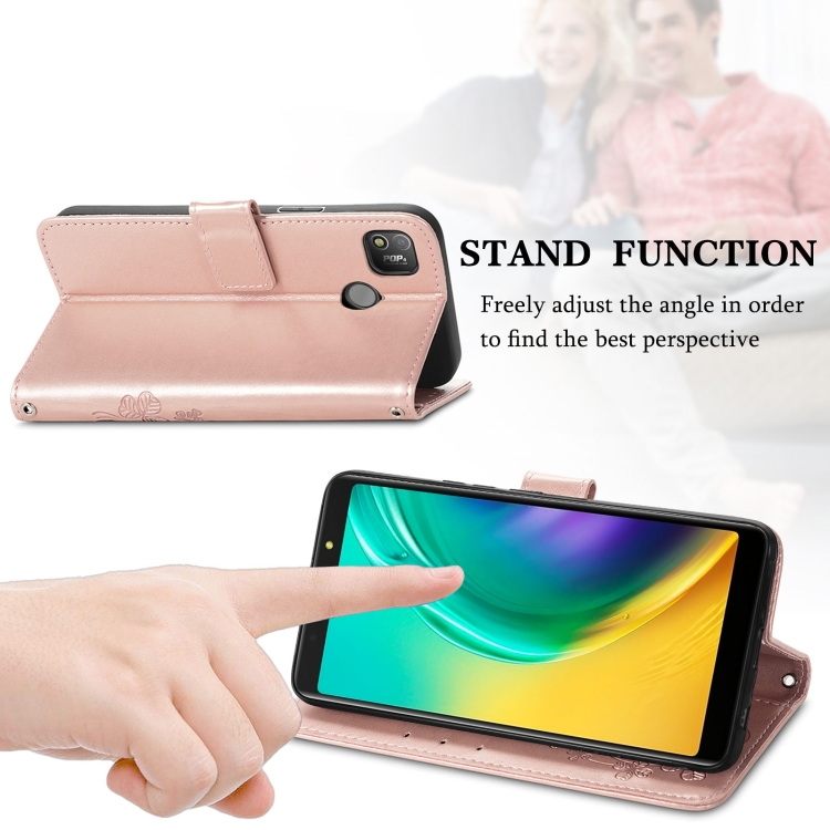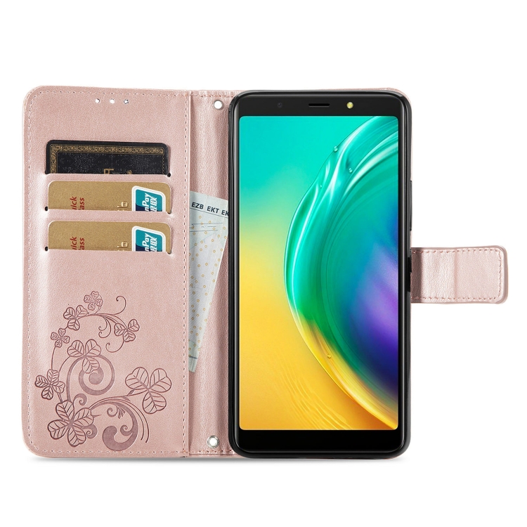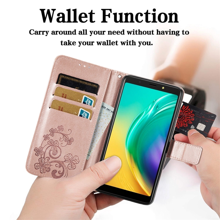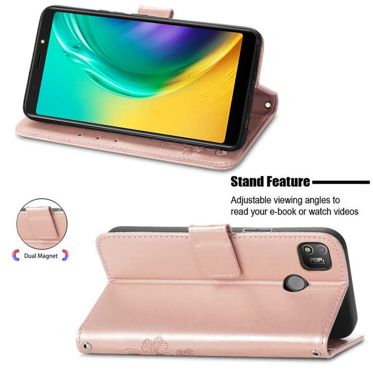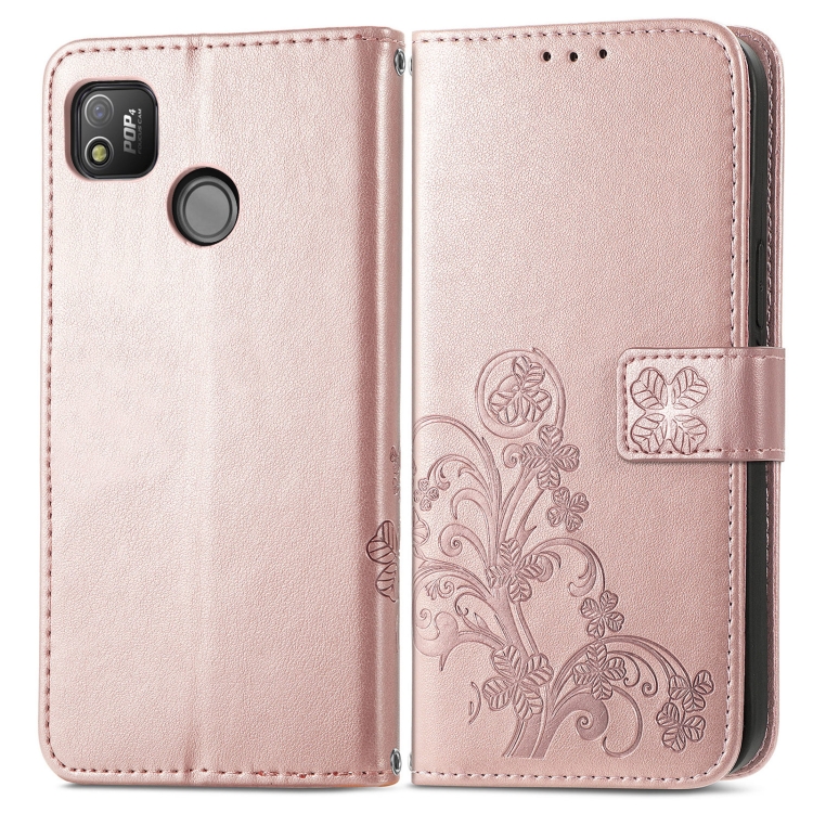 Funda para Tecno Pop 4 con Cierre de Cuatro Hojas, Hebilla en Relieve, Ranura para Cartas y Soporte (Oro Rosa)