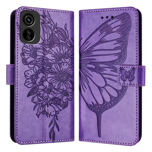 Funda de Cuero para Tecno Pop 6C y Itel A18 con Mariposa en Relieve (Púrpura Claro)