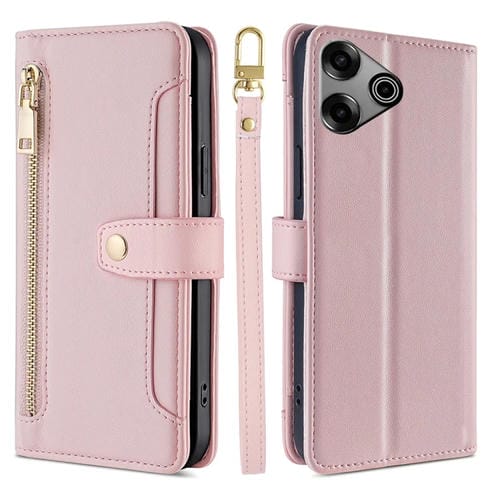 Funda de Cuero para Tecno Pova 6 Pro 5G con Billetera, Cremallera y Textura de Oveja (Rosa)