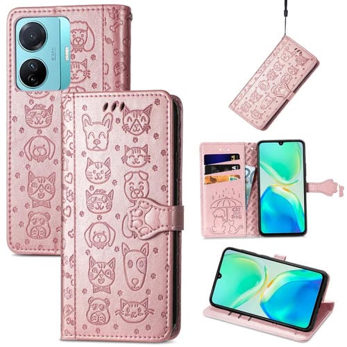Para Vivo S15E Cat And Dog Funda de Cuero para Teléfono En Relieve (Oro Rosa)