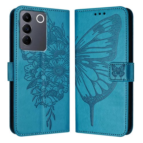 Para Vivo V27 5G / V27 Pro 5G Funda para Teléfono de Cuero con Mariposa En Relieve Global (Azul)