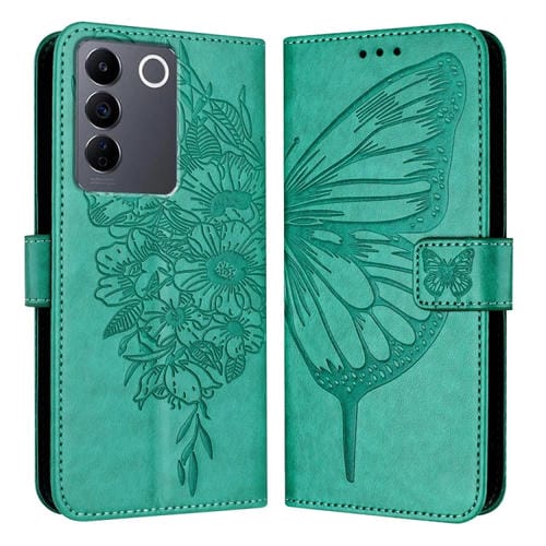 Para Vivo V27E 4G Global / T2 4G Global Funda de Cuero para Teléfono con Mariposa En Relieve (Verde)