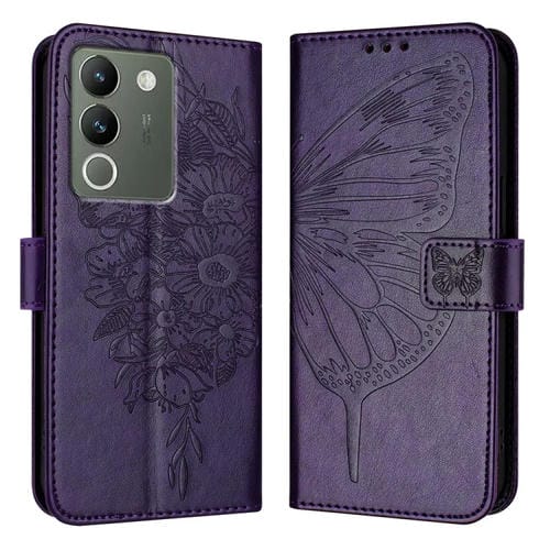 Para Vivo V29E 5G Global / Y200 5G Global Funda de Cuero para Teléfono con Mariposa En Relieve (Púrpura Oscuro)
