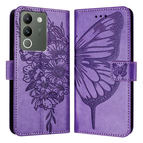Para Vivo V29E 5G Global / Y200 5G Global Funda para Teléfono de Cuero con Mariposa En Relieve (Púrpura Claro)